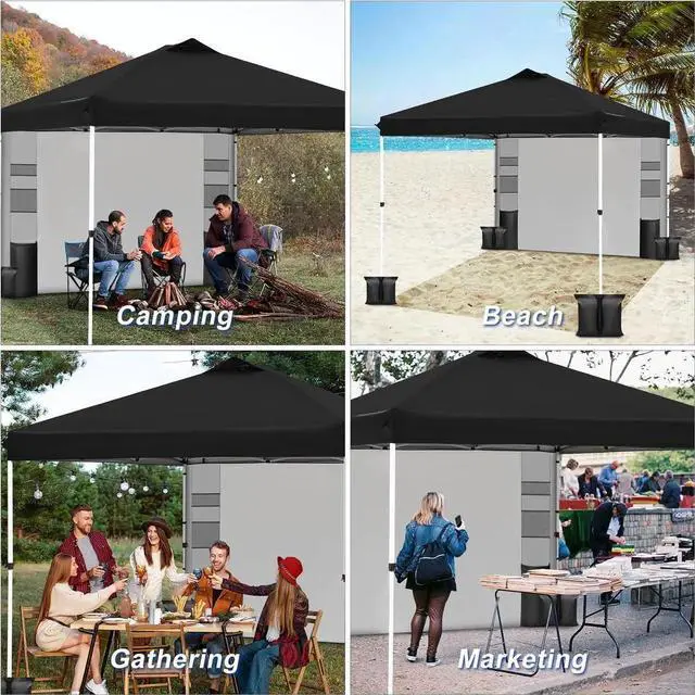 10x10 Pop Up Canopy Tent,One-Button Push Setup,Pop Up Tent with 1 Sidewall and 6 Pockets,Adjustable Height Instant Portable Shelter,4 Weight Bags,Sun Shade for Events & Beach (Black)
