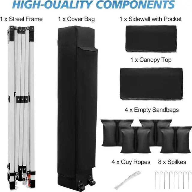 - : The 10x10 pop up canopy features an innovative one-touch central locking system that simplifies the assembly process to less than a minute. Simply press the central locking mechanism and the entire structure snaps securely into place without the need for any tools.The installation can be completed quickly by 1-2 people, making it ideal for outdoor scenes