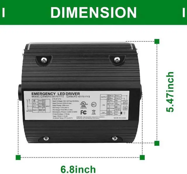 Voltage: Input Voltage 100-347VAC, 50-60HZ, 200mA max output voltage 170VDC. Integration of test switch and charge indicator, Self-test function availablefalse- This LED Emergency drivers got approval of UL DLC. Emergency time 90mins (Min. ), Charging