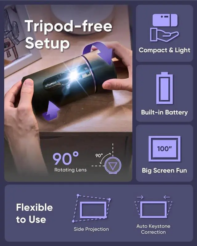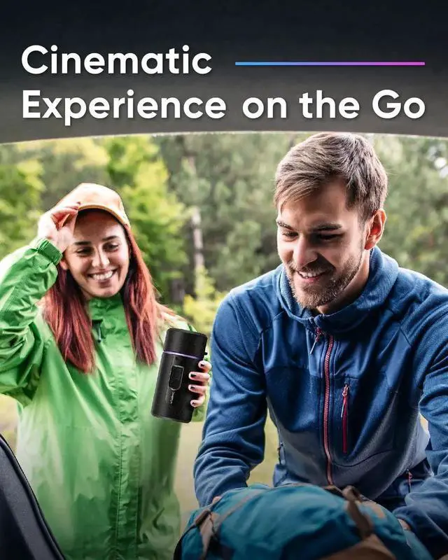 Effortless Setup with a TwistThanks to 90-degree rotatable lens, R150 mini projector can easily adjust the projection angle to fit any room, no matter how small or oddly shaped. Whether you need to project onto a wall, ceiling or floor, this projector can handle it all. Say goodbye to tripod and hello to easy rotationPortability on-the GoBuilt-in battery & Harman Kardon speaker, this projector with wifi and bluetooth provides up to 7 hours of music and 4 hours of movie. Specifically designed for high portability, with a compact and lightweight weighing only 0.72kg. No need to buy extra accessories with the included CARRY BAG and TRIPOD-FREE design, making it a hassle-free solution for you on the go
