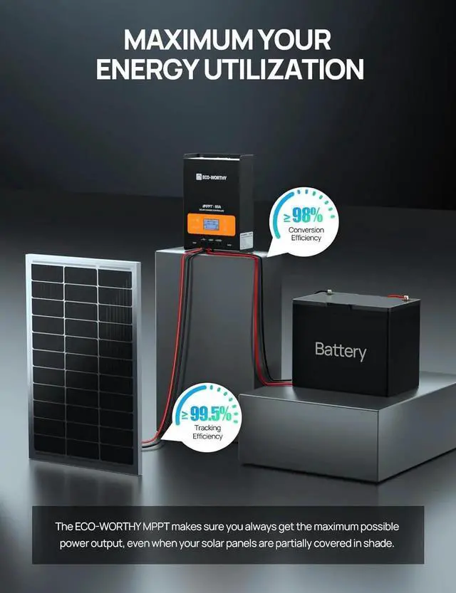 Innovative MPPT Charge Controller: Maximum power point tracking technology, tracking efficiency up to 99.5 %, peak conversion efficiency up to 98%, ensuring maximum possible power output even on cloudy days; Automatic detection of 12V/24V/36V/48V system voltage, rated charging current 60A