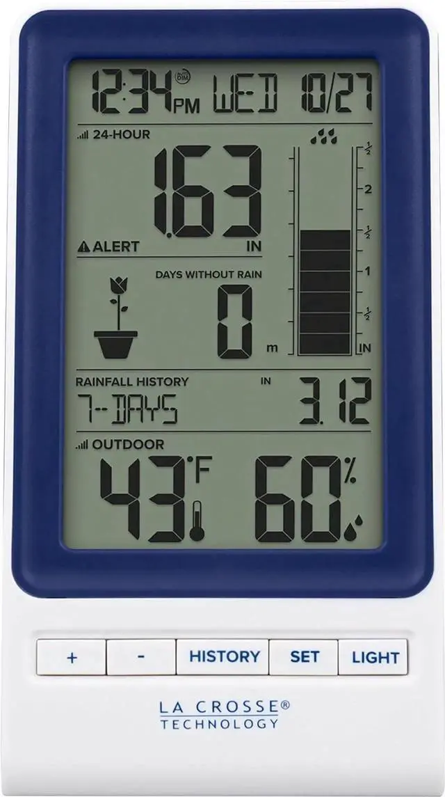Calendar: Day/Month/DatefalseKnow how much rain you got overnight on the new digital wireless rain station. Numeric measurements are monitored on the digital indoor base including historical data and a cylinder rain graph. Wide-mouth rain bucket self-empties from collection rocker and transmits over 330 feet. Adjustable settings with customizable rain alert, and optional backlight feature, allows you to personalize the display to your liking. Requires 6 AA batteries (not included) for complete operation.