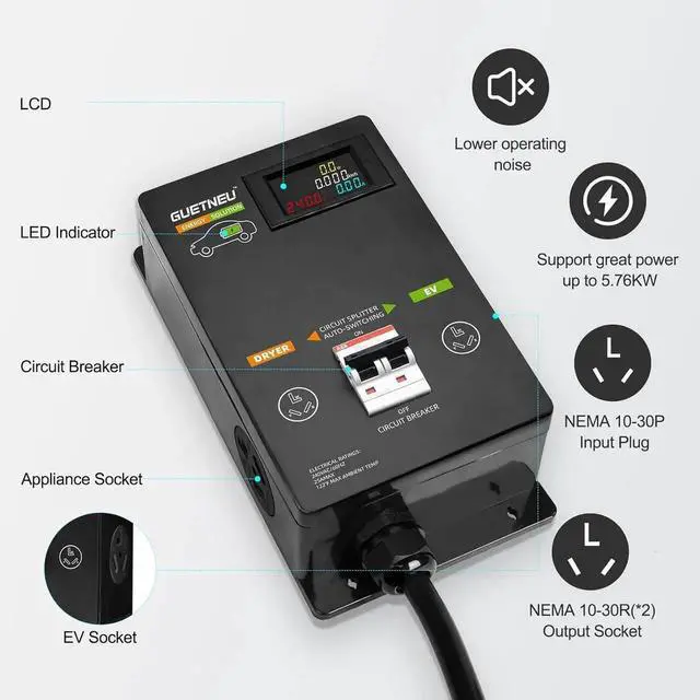 Our automatic power switch enables intelligent switching, ensuring safe transitions between the dryer and EV, with priority supply to left for dryer, optimizing energy usage. Utilizing a new algorithm, accurately identifying device actions. Delivering quieter operation, faster charging, real-time LCD display clear understanding of your