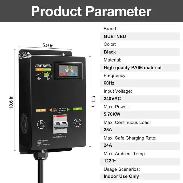 Circuit Breaker: Equipped with a 32 A circuit breaker that identifies and disconnects in case of a short circuit, guaranteeing safety during charging for both your electric vehicle and dryer