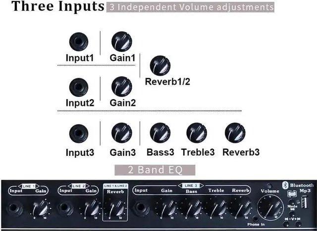 - BluetoothProvide with options of wireless connection, phone input, CD/MP3 input, and USB plugin, it is able to fit in the different connection types, it is convenient and useful with its master control, headphone input and DI output, recording and MP3 function.
