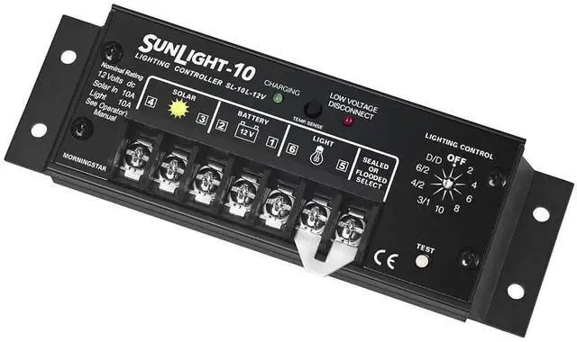 10A PWM CONTROLLER: Morningstar Sunlight Pulse Width Modulation (PWM) 10A solar charge controller delivers reliable 12 Volt battery charging for off-grid solar systems. It regulates power from the solar array to the battery bank. Benefit from lower power consumption and consistent energy harvesting efficiency.LIGHTING CONTROLS: This controller features an integrated microcontroller for advanced automatic lighting control. It offers 10 customizable lighting options and includes an accurate on-board timer. With a user-adjustable rotary digital switch, you can set the lights to remain ON for 2 to 10 hours or for all-night operation. The unique ON/OFF/ON settings conserve energy by turning the lights on 1-2 hours before sunrise. The timer ensures accuracy within 2 seconds.