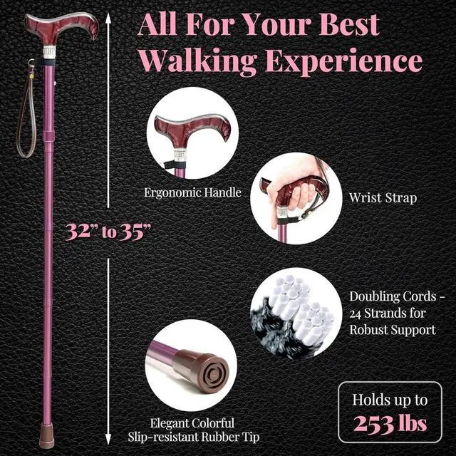 Compact and Adjustable: Fold into 5 sections for easy storage and convenient travel. The height adjusts from 33 to 36 inches, perfect for people 5'2 to 5'10" (158 - 177 cm). It is designed to accommodate rubber ferrules with a 5/8-inch inner diameter. Supports up to 253 lbs (115 kg) for reliable use.