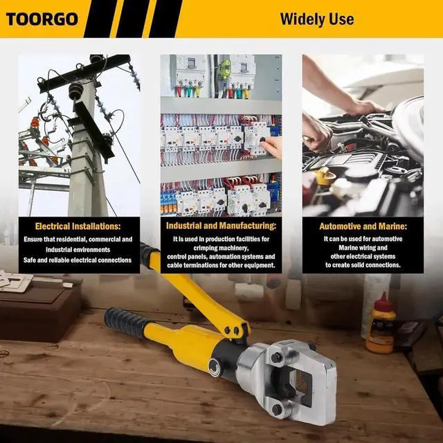 's new hydraulic tool is suitable for crimping wires, terminals, and lugs. The ergonomic long handle provides comfort and labor-saving benefits. With 6 sizes and various dies for different crimping ranges, this versatile tool offers a wide range of applications. Its sturdy steel construction ensures stable and tight crimping, while the safety valve prevents over-pressurization. The rotating head and portable toolbox add convenience for working in tight spaces and easy storage. Wide Use