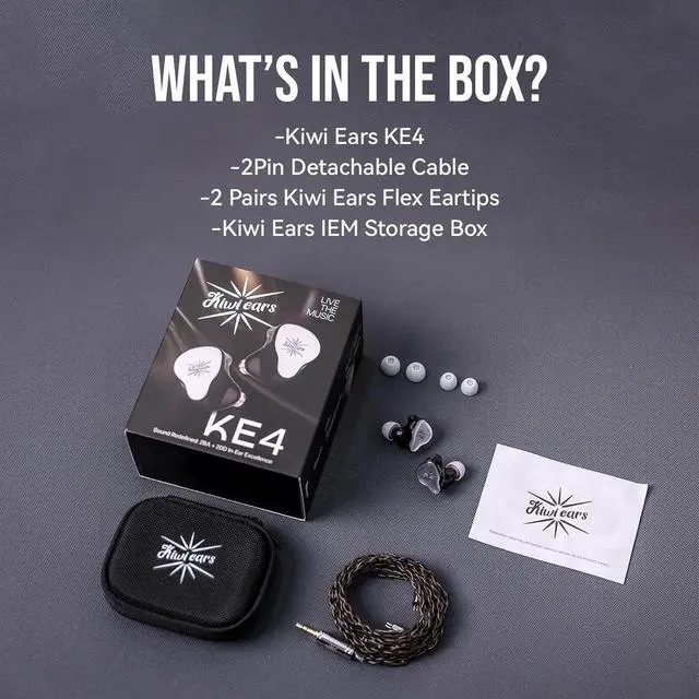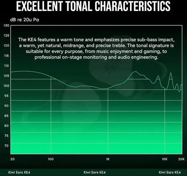 - The KE4 carries Kiwi Ears commitment to excellent tonal balance. It follows our new target tuning, which emphasizes precise sub-bass impact, a warm, yet natural, midrange, and precise treble. It is a sound signature that has been refined throughout the years, and one that we believe to be the most natural and engaging. The tonal signature is suitable for every purpose, from music enjoyment and gaming, to professional on-stage monitoring and audio engineering.