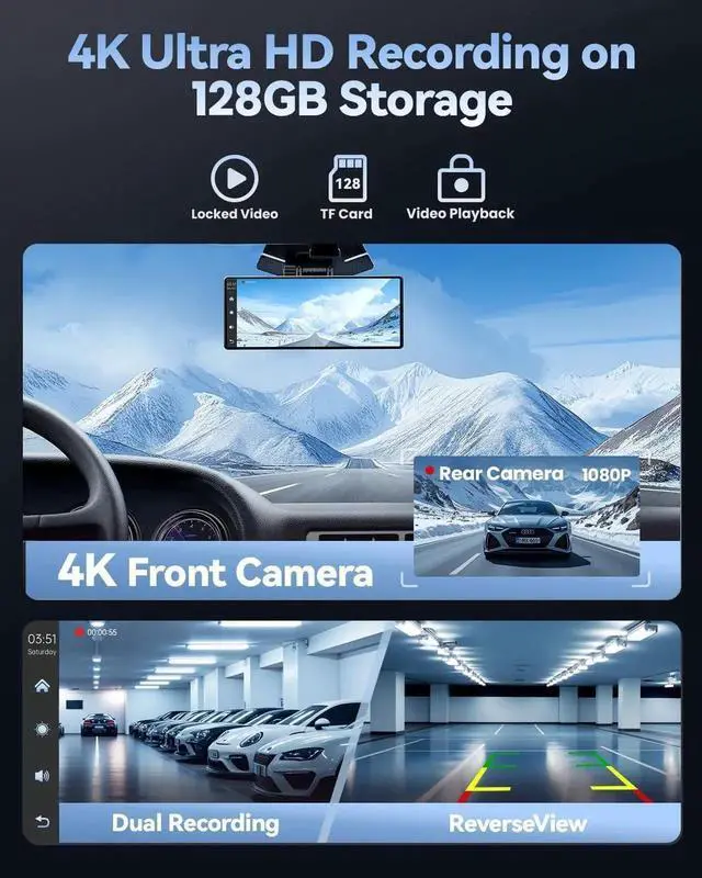 Wireless CarPlay & Android Auto with Voice Control: The Carplay screen for car combines wireless CarPlay & Android Auto, allowing you to easily access essential features like map navigation, calls, messages, and music while driving by simply connecting it to your phone. The voice assistant ensures hands-free control, allowing you to drive more safely4K Dash Cam & 1080P Backup Camera: Equipped with a 128GB TF card for loop recording, capturing every moment on the road. The waterproof 1080P backup camera automatically displays the rearview footage on the car tablet while reversing, making parking safer and easier.Note: The TF card is already installed in the device