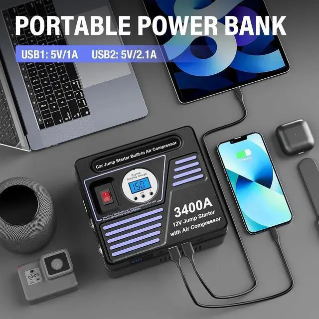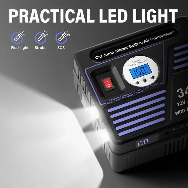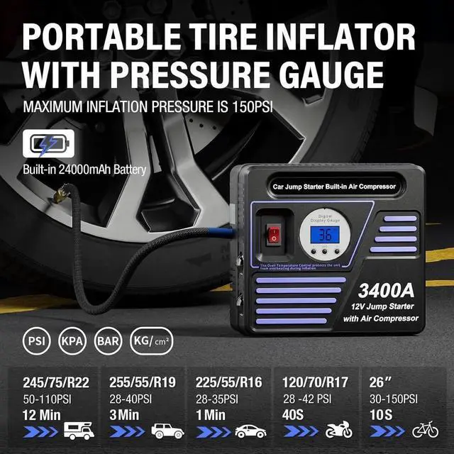 3400Amp Car Jump Starter with Air Compressor, 150PSI Tire Inflator with Digital Screen Pressure Gauge, 24000mAh 12V Auto Battery Booster (10.0L Gas/ 9LDiesel Engine), 2 USB Port 2 Light