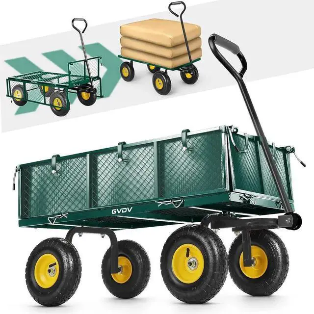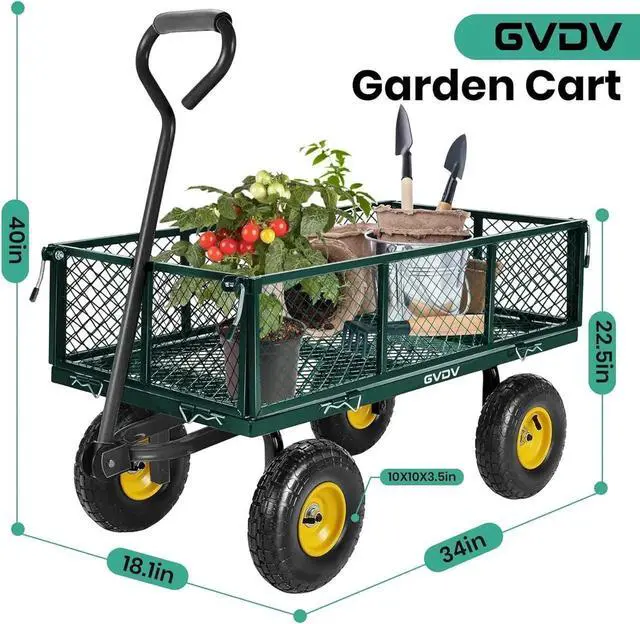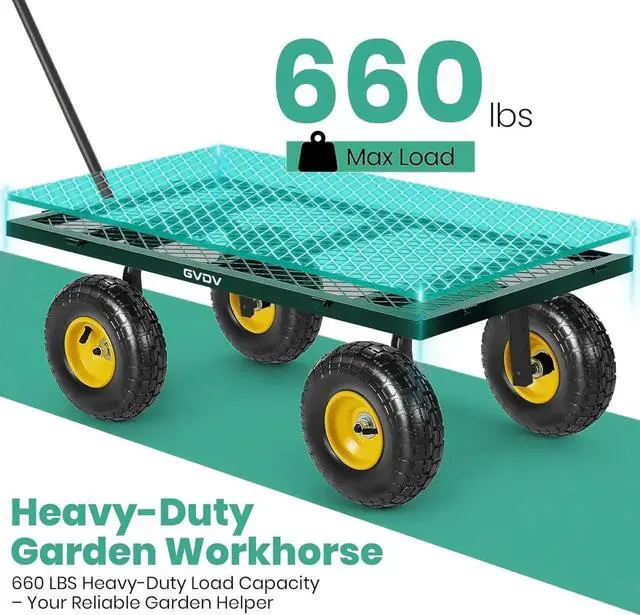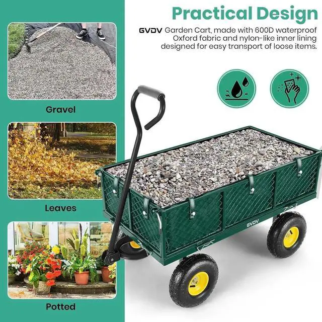 What is the maximum weight this garden cart can carry? The steel-reinforced frame supports loads up to 660 lbs (300 kg), with a 34"× 18.1" mesh bed for transporting heavy tools, soil, rocks, or bulky items like tree branches. Its powder-coated finish ensures long-term durability in all weather conditions.