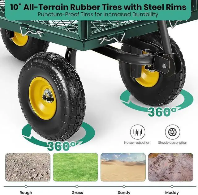 Terrain: Our garden cart flatbed is equipped with 10 inch tires, enhancing stability and security during use. The upgraded pneumatic tires feature noise-reduction and shock absorption. These impact-proof tires ensure the garden cart adapts to various road conditions, such as grass, snow, beaches, rock, etc. Get ready to roll over any surface and go where you need to be!