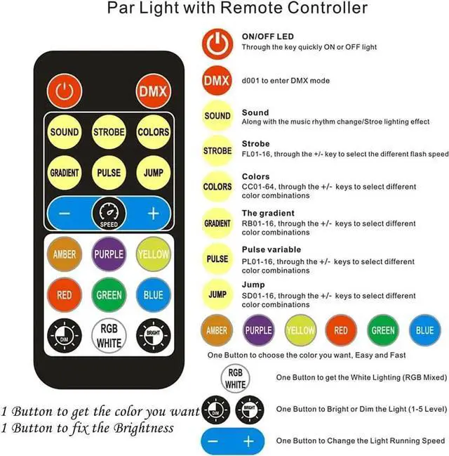 MODES LIGHTING EFFECT: Static Color / Color Changing / Color Fade / Auto / Sound / Master-Slave / DMX. Speed and Sound Sensitivity are AdjustablefalseLONG LIFESPAN is about 50000 hours, Stable, Small with Smart Appearance, Low Power ConsumptionfalseQUICK to Setup with Dual Mounting Brackets to Hang on Truss or Install on a Wall or Put on the Ground, come with 60inch power cablefalse- ONE Button to Get the Solid Color and the Brightness You Want