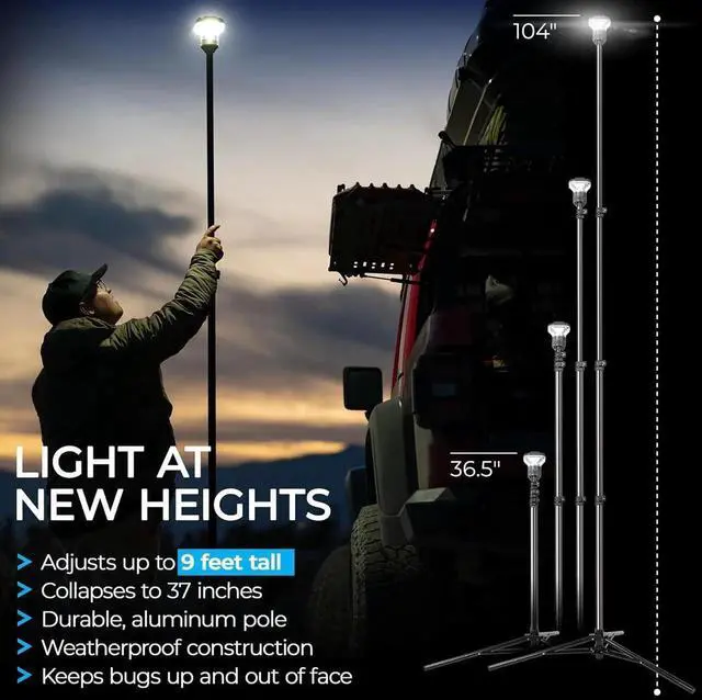 - Customizable Adjustable Height: This portable camping light features a 4-section aluminum pole that extends from 36.5" to 108" (3-9 ft), providing optimal lighting for any situation!