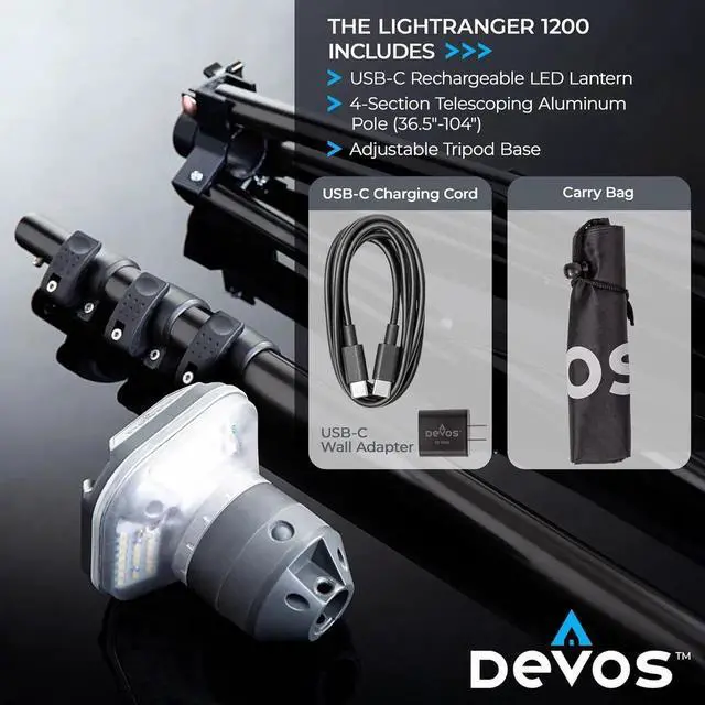 Outdoor Durability: Constructed from sturdy aluminum, this collapsible lantern withstands harsh weather conditions and ensures reliable use on all your adventures. falseIlluminate your outdoor adventures with the Devos Outdoor LightRanger 1200, a cutting-edge high-performance LED tripod lantern designed for those who demand exceptional brightness and versatility in their camping lights. Perfect for a range of scenarios, whether its lighting up your campsite during an adventurous getaway or providing reliable illumination during unexpected power outages. The Devos Outdoor LightRanger stands out with its impressive lumens brightness, ensuring you have ample light to accomplish any task from pitching tents to cooking meals in low-light conditions. Adjust the height for optimal coverage with its innovative adjustable tripod stand that suits varied environments, making it one of the most versatile camping lights & lanterns on the market. When it comes to functionality, this camping lamp goes above and beyond traditional camp lights with advanced features akin to top-tier models like Biolite and SakerPlus. Its rechargeable design ensures long battery life so you can trust it to last through extended expeditions or prolonged emergencies at home. The telescopic flashlight capability adds further convenience easily extend or collapse based on your needs, perfect for tailoring light direction whether utilized as work lights on a stand or as tent lights in vendor booths.