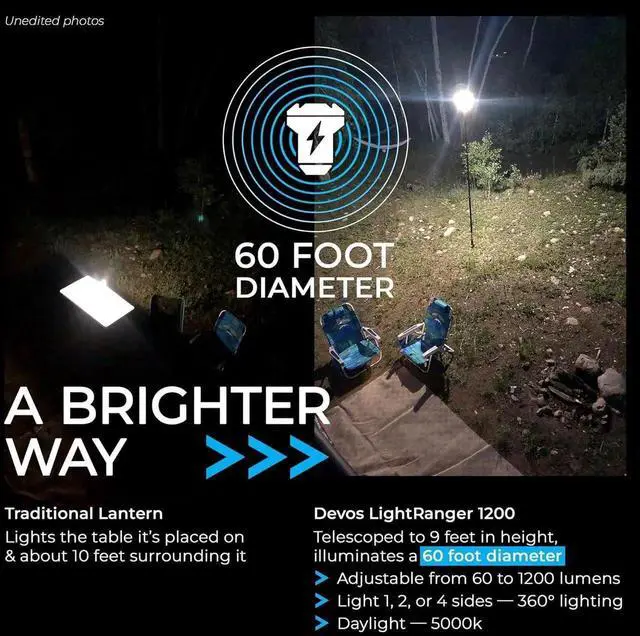- Powerful 1200 Lumens Brightness: Our Devos light ranger illuminates a wide 60 ft diameter area, making it a perfect outdoor portable light & camp lantern for camping, hiking, and backyard activities.