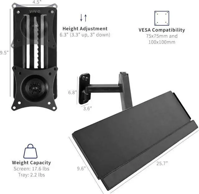 MOUNT-VWKB1 SeriesDesigned to make your work experience more convenient and ergonomic, this combo allows comfortable viewing and typing angles throughout the day. Our wall mounting station allows you to switch to any position easily with its monitor sliding mechanism and counterbalance tray adjustability. Create Your Own Wall-Mounted Workstation