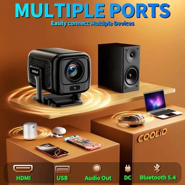 WiFi 6 and Bi-directional Bluetooth 5.4The projector features Bluetooth 5.4 and WiFi 6 dual-band technology (2.4GHz and 5GHz), making it easy to connect multiple devices with the latest upgrade. With bi-directional Bluetooth 5.4 audio transmission, you can connect Bluetooth headphones or speakers to use it as a stereo in standby mode and with built-in 360° surround sound for a cinema-quality audio experience. Enjoy seamless entertainment with ease.
