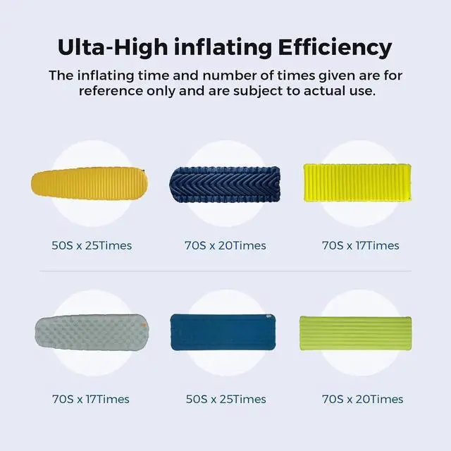 - Powerful Inflation and Deflation-Don't let its compact size fool you - our air pump is packed with power! Equipped with a small but robust motor, it can quickly inflate your sleeping pads in about 50 seconds. Plus, it operates quietly with a noise level as low as 68 decibels, so you can enjoy a peaceful and comfortable inflation experience