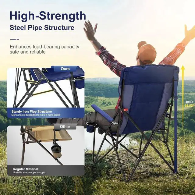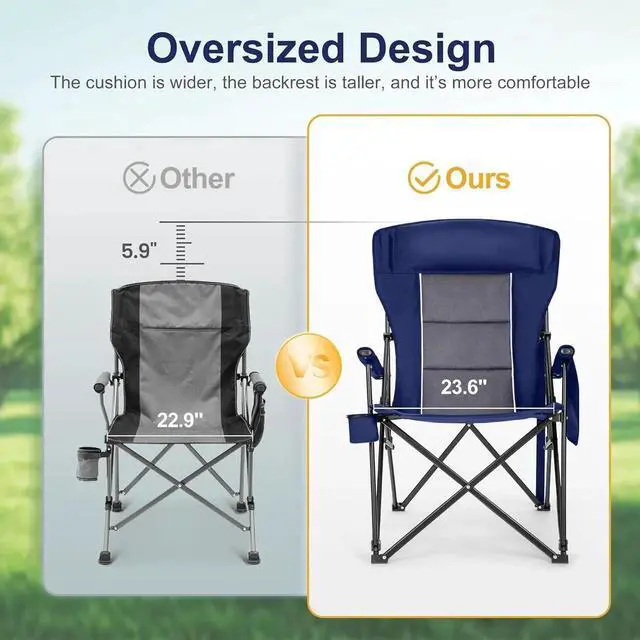 Bigger & Wider Design: Our newly upgraded camping chair is larger and wider than most on the market. With dimensions of 42.91*29.33*26.57in, it's perfect for bigger folks and can support up to 500 lbs.