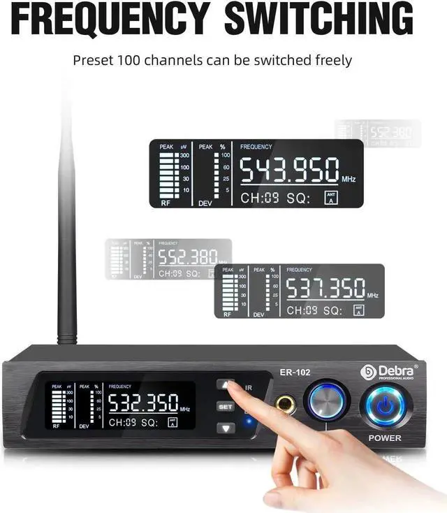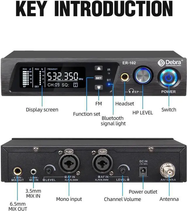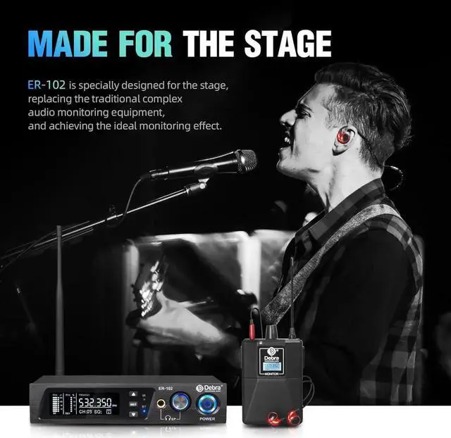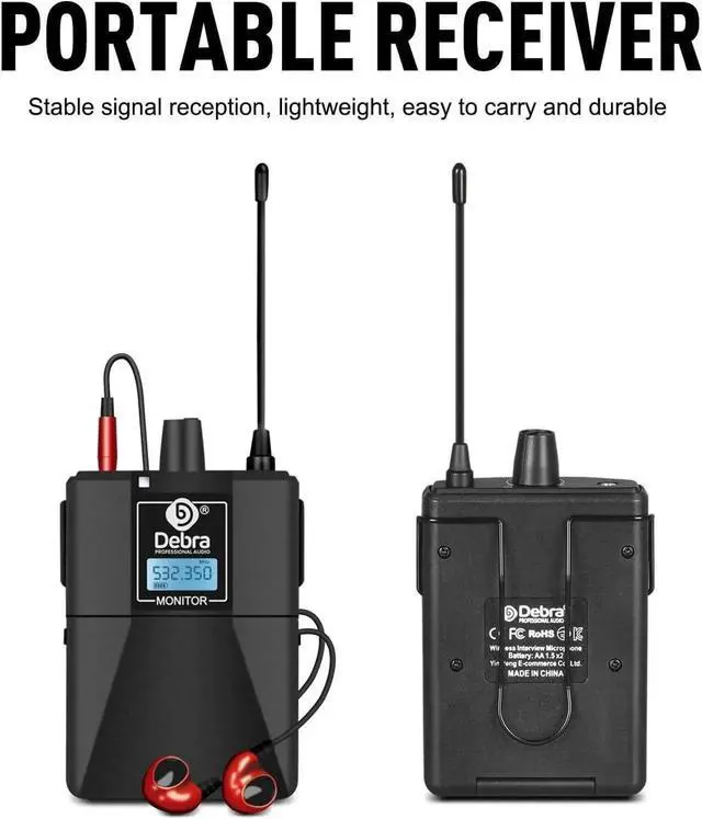 The PRO UHF Mono Wireless In Ear Monitoring System: D Debra audio's new UHF system with phase-locked loop PLL. It using high-quality IC chips, improves the overall performance, anti-frequency reduction, anti-series frequency, has a stronger and more stable signal, better signal to noise ratio. The frequency range is 510 MHz-580 MHz. The preset 100 frequencies for each channel can be switched at will, which can better avoid signal interference.Suitable For Multiple Places: Built-in limiter circuitry eliminating distortion under excessive input levels. Front panel 1/4-inch monitoring has the headphone jack. Back panel have 6.35 mixed input and two channel independent integrated interface input. Good used in stage, broadcast, recording studio, musicians, band performance.