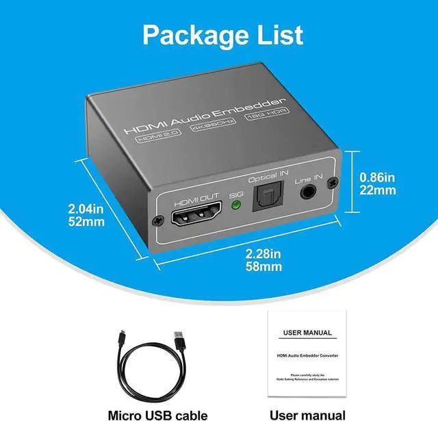 HDMI Audio Embedder Inserter Digital Analog + DVI to Support TOSLINK Optical 3.5mm Jack AUX Sound Input 4K60Hz 18Gbps HDR HDCP2.2