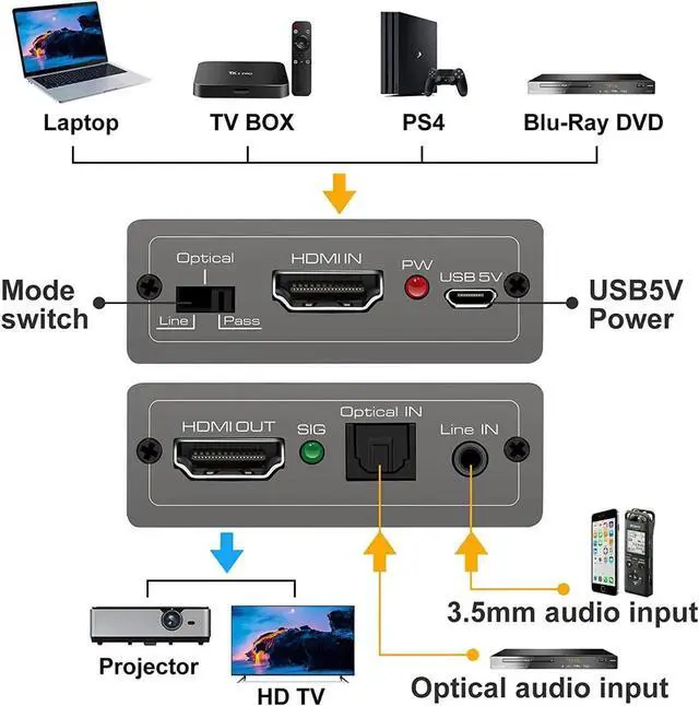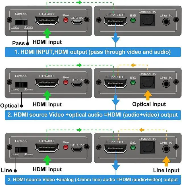• Digtal/Analog audio to HDMI embedder inserterUse external audio from either digital (optical---TOSLINK/SPDIF) or analog (3.5mm/line) sources to replace the audio from an HDMI signal(Note that the original HDMI sound is replaced, not mixed with the original HDMI sound.). Flip a switch and choose which source youll hear on your HDMI display without moving cables.