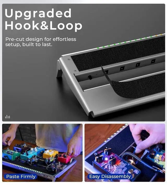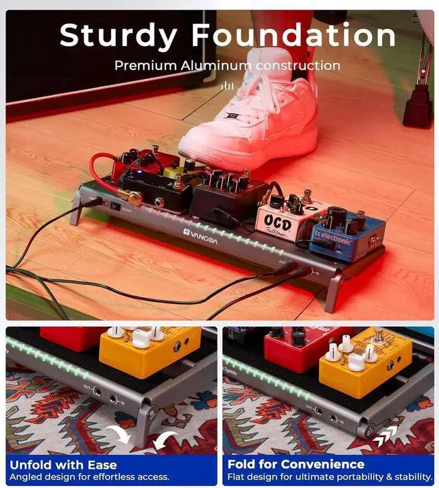 [Stable Foldable Legs] 20-degree elevation angle helps you touch the guitar pedal comfortably, ensuring accurate operation on the stage, while more compact, and easier to use. No matter used as a flat or angled pedalboard, its durable foot pads hold the board in place securelyfalse[Solid-built, Reliable Support] Aerospace-grade aluminum alloy is sturdy yet ultra-lightweight. Being as strong as structural steel, the one-piece bent design has no welding bump and brings stability to the utmostfalse[Beating Light Effects] The party always gets livelier as the light began to flow. This pedal board ensures excellent sound and lighting effects that build up to a rousing climax, making your show unique and more excitingfalse- [All-in-One Design] Built-in TRUE ISOLATED power supply for gigging or playing live in any capacity with 8 outputs, results in great noise reduction also a tidy, more intuitive pedalboard operation overall, keeping you away from ground loops, just enjoy your music
