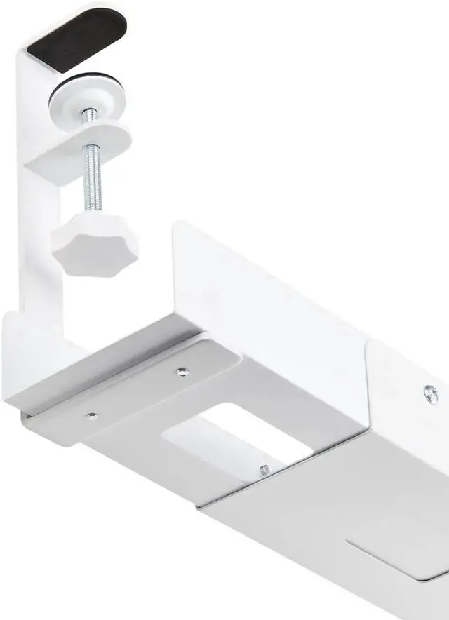 This under-desk cable management tray helps keep workspaces organized and free of clutter, reducing the risk of tripping hazards and tangled cords. The extra-large tray is 4.1 inches (105mm) wide and has additional headspace between the desk and the tray to accomodate larger power adapters or power bars/strips. The cable manager tray is length adjustable, offering three different lengths ( 2.6 ft, 3.3 ft, and 3.9 ft / 0.8 m, 1m, and 1.2 m) to match the desk size and the distance cables need to be routed. All necessary hardware for length adjustment and product installation is included. This cable organizer works with desks of any material, including wood, glass, and metal, from 0.2 inches (5mm) to 2inches (50mm) thick. Cable management slots improve accessibility and enhance workspace aesthetics by keeping cords neatly routed, contributing to better airflow. The organizer tray features a clamp-on installation, allowing for a tool-free setup with no drilling required. This makes it ideal for quick repositioning without damaging the desk. Foam padding protects the desk surface, while rubber on the clamp prevents slipping when attached.