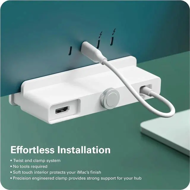 [Effortless Installation]Engineered to fit securely to the bottom of your iMac. Easy installation with a twist and cla system that requires no tools. Soft touch interior protects your iMacs finish while the precision engineered cla provides strong support for your hub. Dgn for iMac 2021 24" models*Not coatie with previous models of iMac.