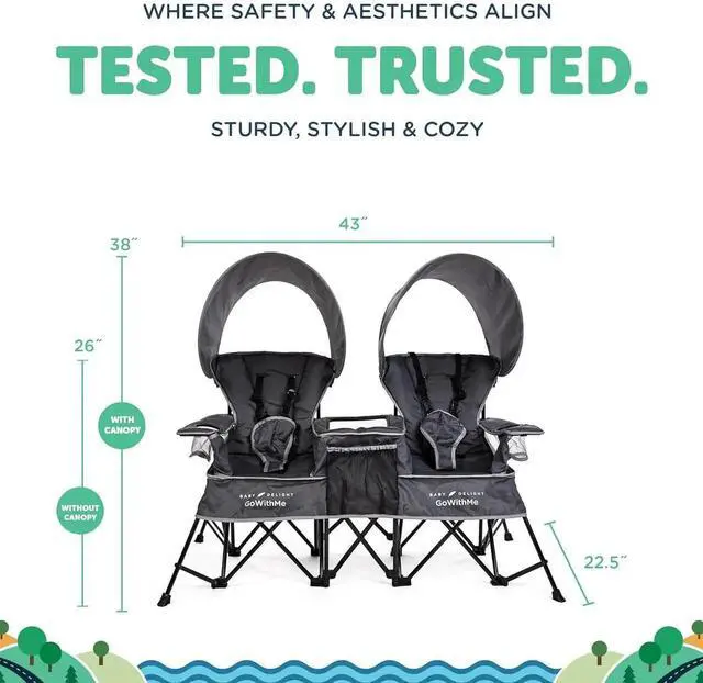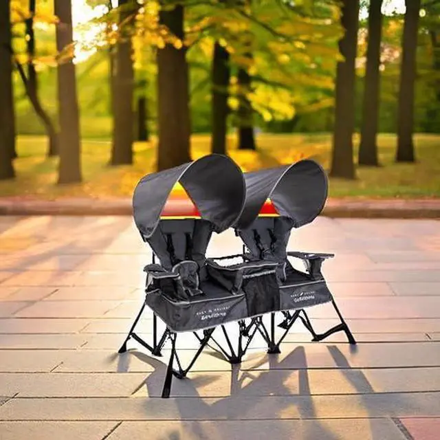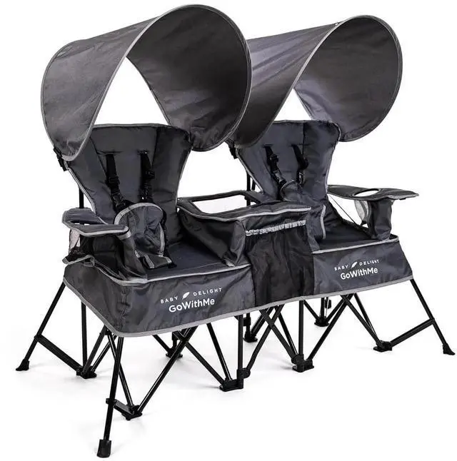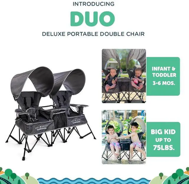 The Go With Me Duo Deluxe Portable Double Chair is perfect for twins, siblings or besties! This one-of-a-kind chair unfolds to reveal two separate seating areas for little ones ages 3 months 75 lbs. Added safety features include a strong, stable flared leg system, as well as locking mechanisms and a 5-point safety harness on each seat (which can be removed as the children grow). For outdoor adventures two removable sun shades can be added quickly and easily. The built-in cup holders are sure to come in handy for bottles as well as sippy cups. And for storing snacks, toys or books, easily accessible storage pockets are included between the two seats. When its time to get up and go, simply fold the Duo up and place it into the included storage bag. Ready? Set. Adventure, together!