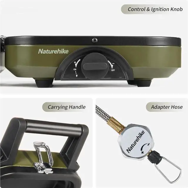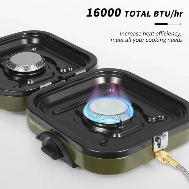 [PORTABLE AND MULTIFUNCTIONAL] Naturehike's folding camp stove is portable and lightweight, folding into a small handbag size( 10.6 x 8.5 x 5.1 and 5.5 lbs in weight). It eliminates the need for extra frying pans, making cooking a breeze with its built-in griddle. false[BUILT TO LAST] The 2 burners are made of rust-resistant, heat-resistant 430 stainless steel with a durable matte frosted shell surface. Capable of supporting 11 lbs each, compatible with isobutane or mixed isobutane fuel canisters. false[STEPLESS ADJUSTMENT] The 2 burners can be controlled separately with a stepless adjustment feature.