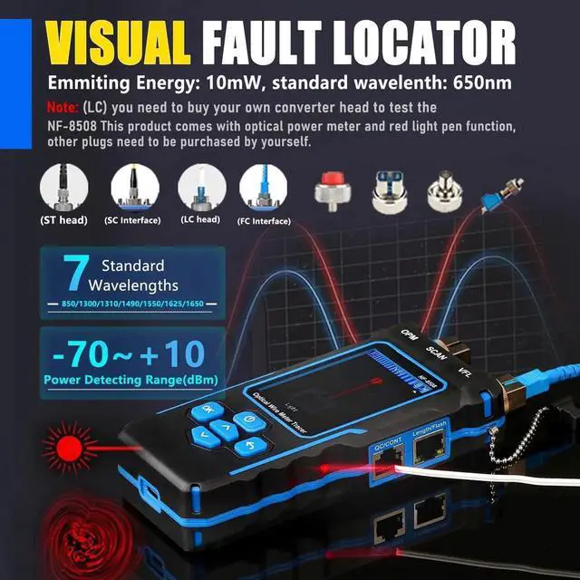 EFFICIENT VISUAL FAULT LOCATION (VFL) QUICKLY DETECTS FIBRE BREAKS AND POOR CONNECTIONS: The NF-8508's VFL function (Visual Fault Locator) efficiently identifies fibre breaks, poor contacts, bends or cracks. With 10mW output power and 650nm wavelength, you can quickly locate faults in the fibre and improve troubleshooting efficiency. This function is ideal for fibre engineers and maintenance personnel to install and debug, especially in data centres, telecom companies and intelligent buildings, fibre optic fault maintenance, fibre optic network monitoring and other environments, to ensure that the fibre optic link is stable operation, to avoid network interruption