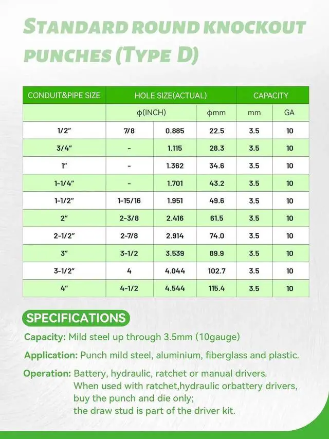 This hydraulic knockout hole punch driver kit features a compact and durable structure with high hardness and great quality, easy to operate to get a perfect, uniform hole. Suitable for power engineering, automobile modification, construction, machine tool sheet metal and other industries