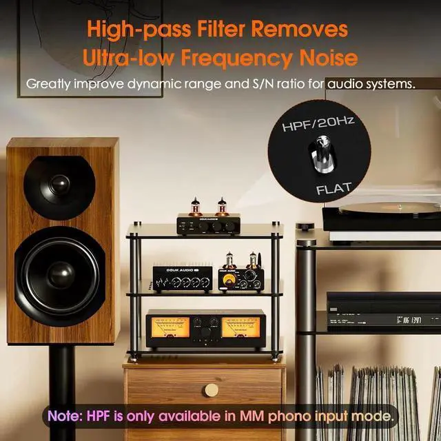 Clearer Vinyl Playback withF: The integrated high-pass filter (only avail in phono input) cuts off subsonic noise below 20Hz, reducing distortion and improving sound clarity. It ensures a cleaner playback, making your records come alive with reduced rumble and better dynamics.