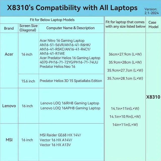 • Model No.: X8310; internal dimensions of the case: 36.3x28.4x2.8 cm (14.3x11.18x1.1 inch)