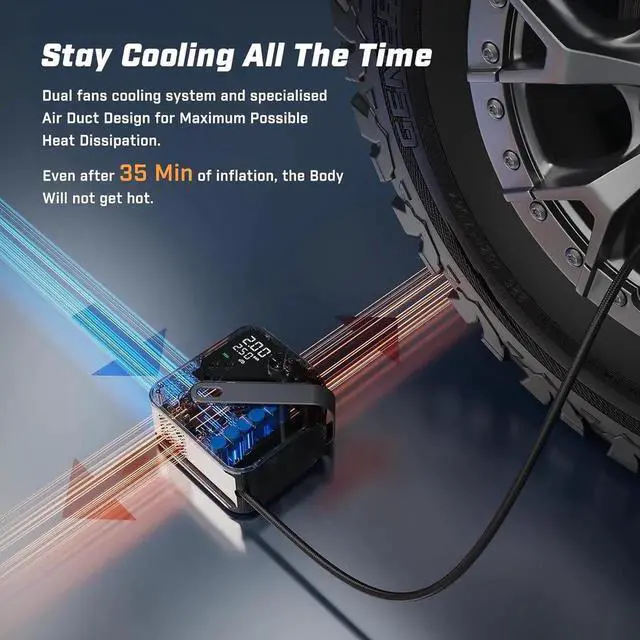 Reliable Performancehigh-performance self-developed motor combined with a unique cooling system enables up to 35 minutes of continuous working. You can continuously inflate all TWO tires of F-150 (315 70/R17 ) from 0 to 36 PSI, without the need for breaks in between