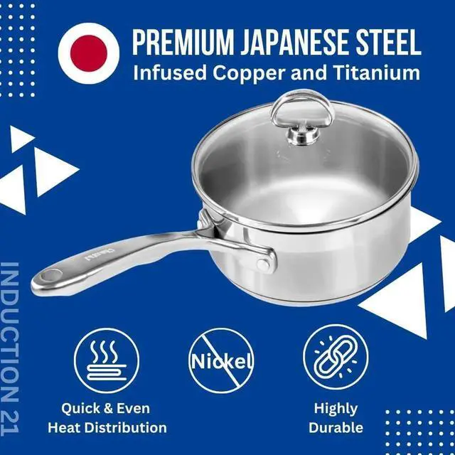 Made from strong Japanese steel, the construction and design of the Induction 21 Steel cookware line guarantee superior quality. Each piece has copper melted into the steel, which effortlessly conducts heat quickly and evenly. Titanium is also added for strength and durability to endure everyday cooking. To ensure healthy cooking, the steel is nickel free to prevent allergic reactions to nickel. The tempered-glass lid makes it easy to monitor cooking and the dripless pouring rim reduces spillage along the side of the body. The 2 qt. saucepan is the perfect choice for tender vegetables or delicate sauces. It features a wide flat bottom, straight sides to maximize capacity and a cool to the touch, long ergonomic handle. This is the best steel for magnetic induction and perfect for all cooktops. Oven safe. Dishwasher safe. Limited warranty. Product dimensions 4" height 6. 5" opening diameter 5. 5" exterior base diameter. Founded in October 1971, Corporation is proud to be approaching 50 years of strength, determination and success. CEO and Founder, German-born Heida Thurlow, relocated to the United States in 1970 and soon began her entrepreneurial journey.