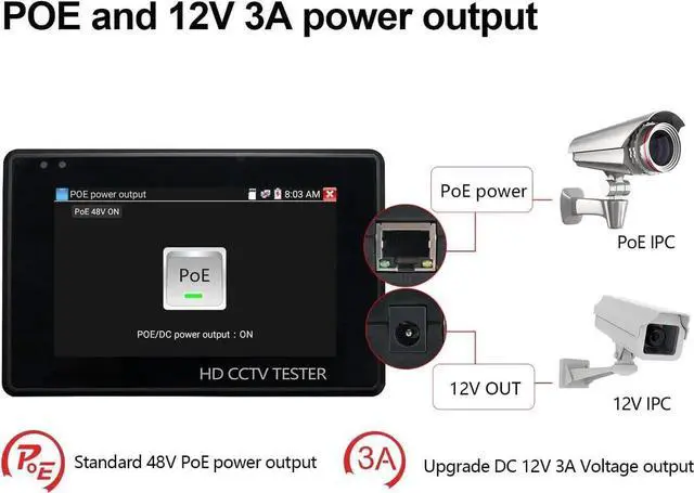 - [ Multi-function CCTV Tester ] It has network tools, PING test, IP address scan, port flashing, dhcp server, etc. It support max 30W POE power output, temporarily powers the camera or other devices supported by the IEEE 802.3 af/at standard protocol. Support DC12 3A power output. Built in Wi-Fi, create WIFI hotspot. 7.4 V /2400mAh Lithium Ion Polymer Battery