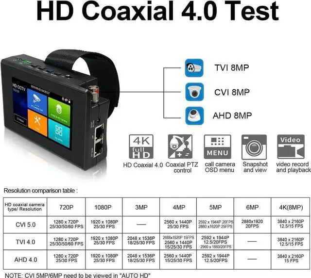 - [ TVI CVI AHD Camera Tester ] WANLUTECH CCTV camera tester supports to test max 8MP AHD/TVI/CVI/CVBS camera. Using "AUTO HD" app can automatically recognize AHD CVI TVI CVBS cameras and display resolution and frame rate on the screen, supports UTC control & call OSD menu
