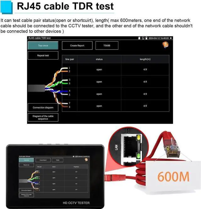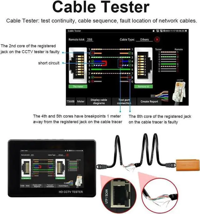- Cable Tester: UTP cable tester support test UTP cable connection status and display on the screen, can save testing report, RJ45 cable