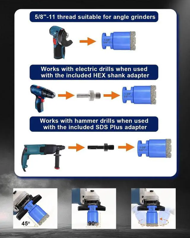 Wide Compatibility5/8''-11 thread suitable for angle grinders. Works with electric drills and hammer drills when used with the included HEX shank or SDS PLUS adapters, making it a must-have for professional contractors and DIYers.