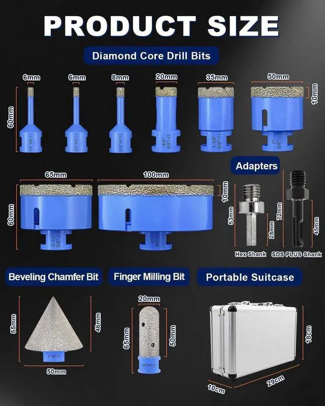 • Premium Brazed Diamond Technology Engineered with vacuum brazed diamond coating, our drill bits offer faster, cleaner, and longer-lasting performance compared to electroplated bits. Perfect for porcelain tile, ceramic tile, granite, marble, quartz and stone etc.