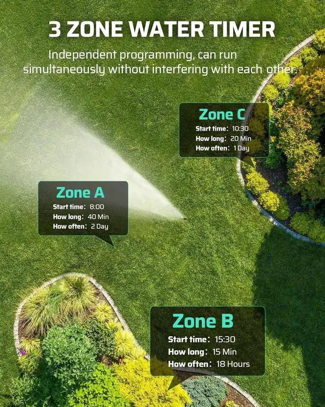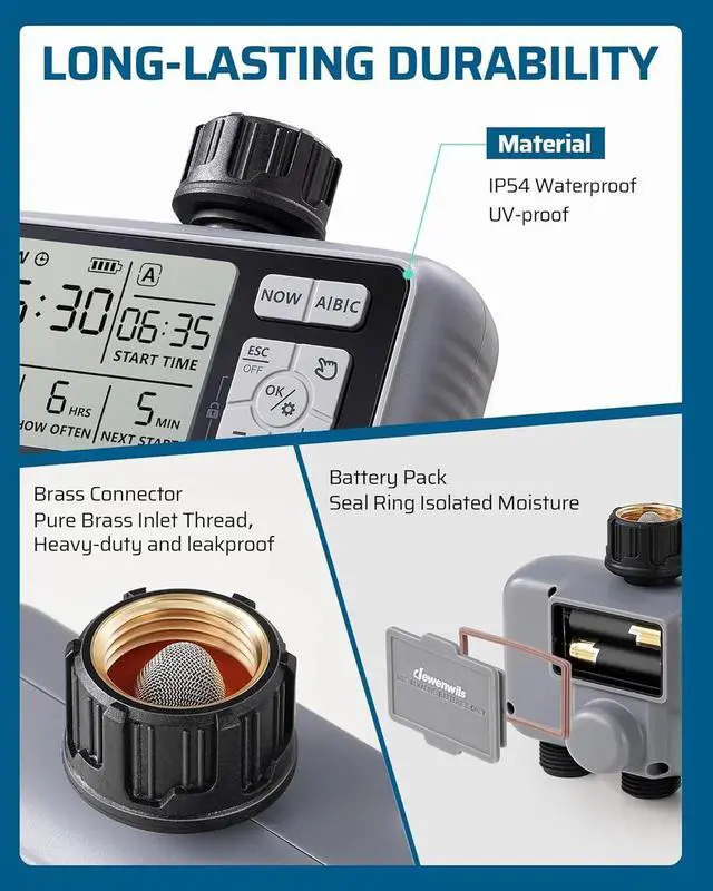 [Dependable & Watertight] Crafted from durable brass at the inlet and included adhesive tape (you can wrap around the faucet) ensure a snug connection with the sprinkler timer; this setup preserves water pressure unaffectedly, enduring pressures of up to 120 psi; sun-resistant ABS plastic shell and IP54 waterproof rating are ideal for outdoor applicationsfalse[Multi-Mode & Child Lock] The manual mode is intended for short-term emergencies without altering the preset automatic programs; rain delay mode prevents excessive watering of plants/flowers during rainy spells, conserving water; the child lock feature guarantees that children and pets cannot disrupt the water timer's operationfalse[Battery Recommendation & Warranty] Operated by 2 1.5V AA batteries (batteries not included), the valve will automatically close when the battery charge is low; 1-Year Warranty provided, DEWENWILS professional customer service team offers 24/7 delicate support, we are always standing by youfalse- [3 Independent Zones] Our faucet timer offers individual control over 3 zones (A, B, C), enabling tailored adjustments for start times, watering durations (1 second to 360 minutes), and watering frequencies (every 1 hour to 15 days); ensures optimal watering schedules for gardens, yards and lawns