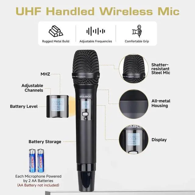 - Easy to Operate Just turn on the receiver and mics, the wireless microphone system will match automatically. 2 x AA batteries (not included) are required for each mic. The receiver has two separate XLR balanced outputs and a 1/4 "mixed output. STABCL microphone wireless are perfect for singing, karaoke, church, performance, dj stage, conference and other occasions. They're the ideal choice for any event where you need to be heard clearly and effortlessly.