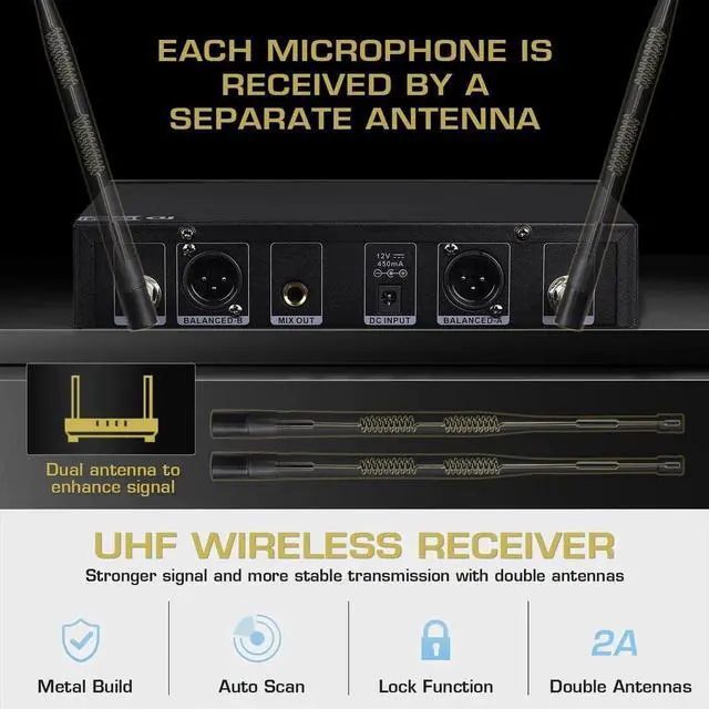 - Sturdy BuiltSturdy metal build for both wireless receiver and handheld microphones. The endurable wireless microphone system is equipped with a cardioid dynamic cartridge for clear, robust optimal true sound. Professional circuit design, signal transmission will not be broken when it is used stably, and built-in intelligent noise reduction function can effectively prevent noise.