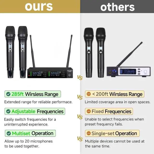 GetWireless microphone set package contents: wireless receiver x1, handheld microphone x2, antennas x2, Anti-slip ring x2, 1/4 audio cable x1, power adapter x1, Instruction x1. - UHF Dual-channel Professional Wireless Microphone System2x100 frequency optional, each microphone supports 100 frequency replacement( 512.50 - 536.75 and 537.00 - 561.75 ). The signal receiving distance can reach 300ft. Multiple microphones can be used at the same time, effectively avoiding the interference of equipment with the same frequency. With frequency locking function, it can effectively prevent others from interfering with the system settings during the performance.