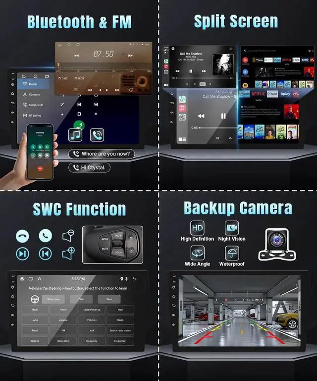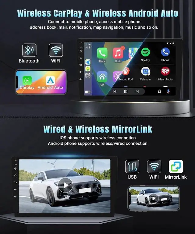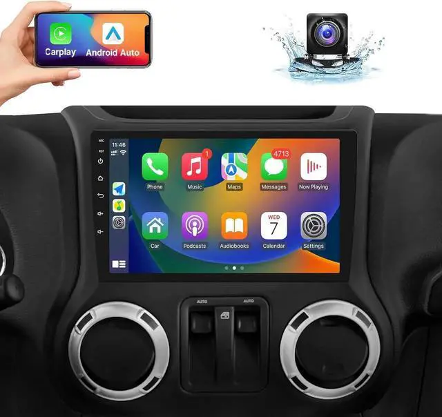 Android 12 system, 4-Core processor, 2G RAM+32G ROM, 10.1 inch 2.5D IPS touch screen, wireless carplay, wireless android auto, wired/wireless mirrorlink, offline/online GPS navigation, WIFI connection, bluetooth 5.1, FM radio, AHD backup camera, SWC, split screen, 2 USB, EQ adjustable, multiple UI and wallpaper choose. Car Stereo with Bluetooth 5.1 & FM RadioYou can answer/make calls and be hands-free without distractions via bluetooth. This head unit for jeep wrangler jk stereo upgrade built-in clear mic and equipped with external mic jack in RCA cable.