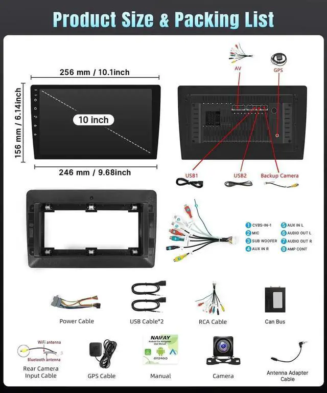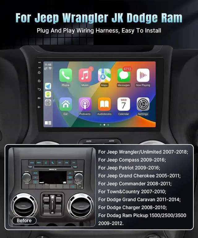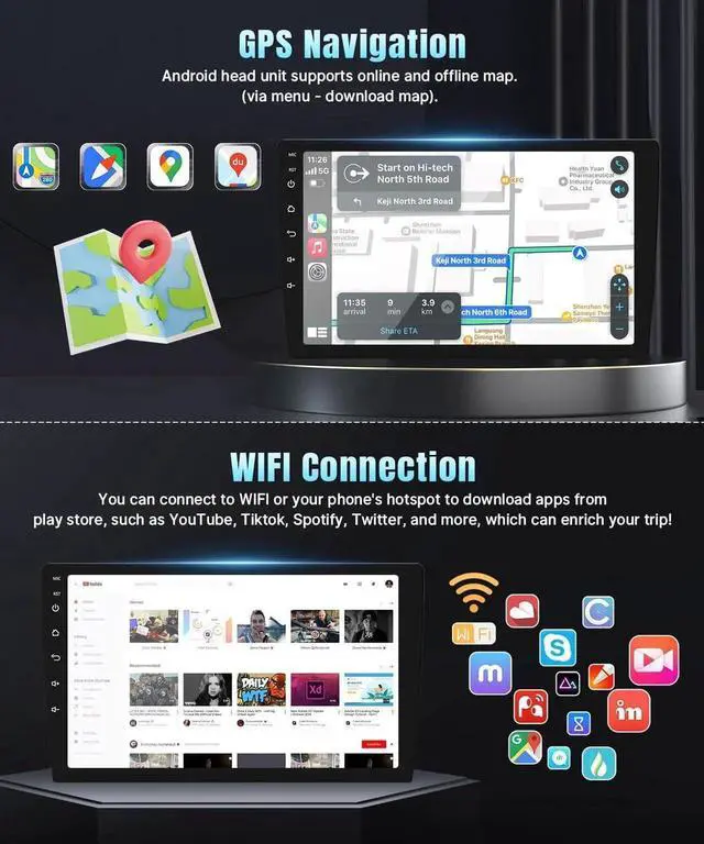 In-dash GPS Navigation & WiFi ConnectionThis screen for 2016 jeep wrangler radio comes with a GPS module, once connected to wifi or your phone's hotspot, you can download offline maps or use online maps at any time(via menu - download map). And you can also download many other apps in the app store of car stereo like youtube, Spotify, Youtube, BBC Sounds, WhatsApp, etc., as the same as a big smart phone. Plug and Play Android Car StereoThis Naifay double din radio fits for jeep grand cherokee radio replacement comes with a wiring harness for plug and play installation.